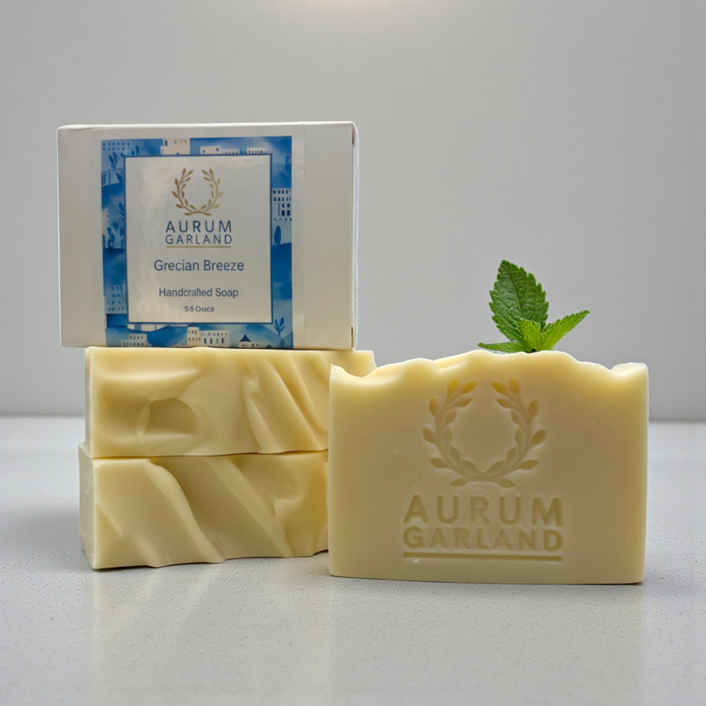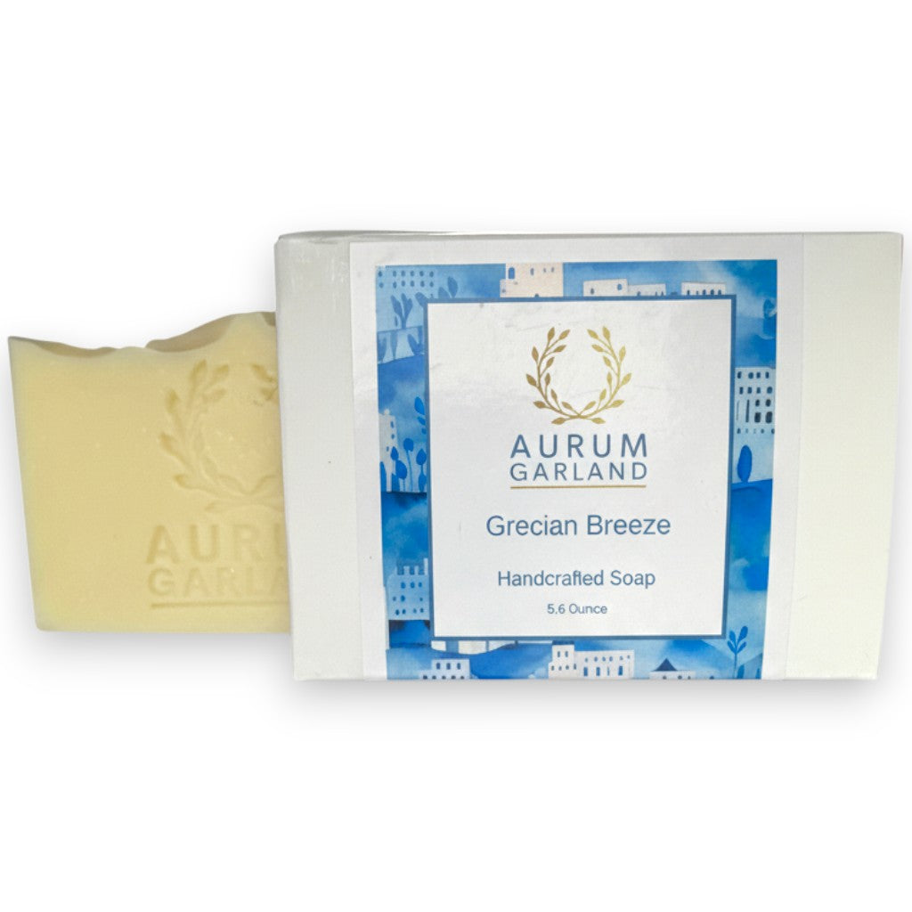 The Story: Grecian Breeze is a soap that captures the refreshing spirit of Greece. With a blend of spearmint, lavender, rosemary, and eucalyptus essential oils, each lather evokes crisp island breezes and blooming hillside gardens. Inspired by Greek bathing rituals, this bar delivers a clean, herbal scent that transports you to sunlit Mediterranean shores, leaving skin soft and revitalized.